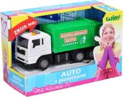 Gør dig klar til aktion med skraldebilen, der er 17 cm stor og drevet af inerti. Med lys- og lydeffekter giver det en realistisk oplevelse. Knapperne på kabinen aktiverer tre sange fra Míša Růžičková: Skraldefolk, Politi, og Ambulance.