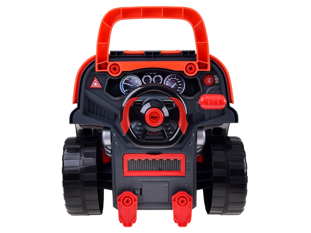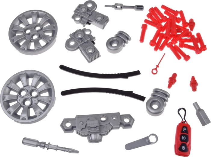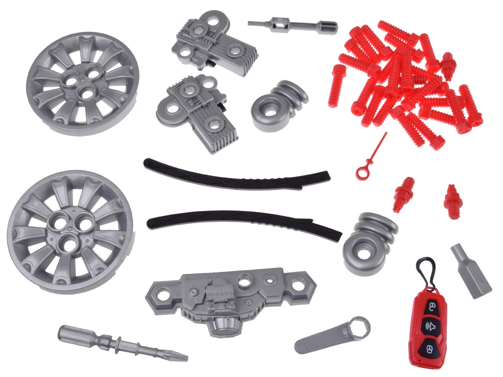 Inkluderet er masser af tilbehør: skruer, skruetrækker med unbrakonøgle, 4-vejs værktøj, oliepind og filter, nummerpladeskilt samt støtter til at “løfte” bilen. Drejelig rat med fungerende horn og gearvælger giver ekstra sjov.