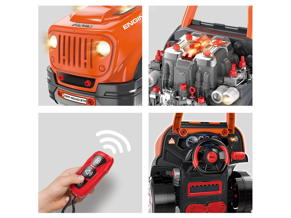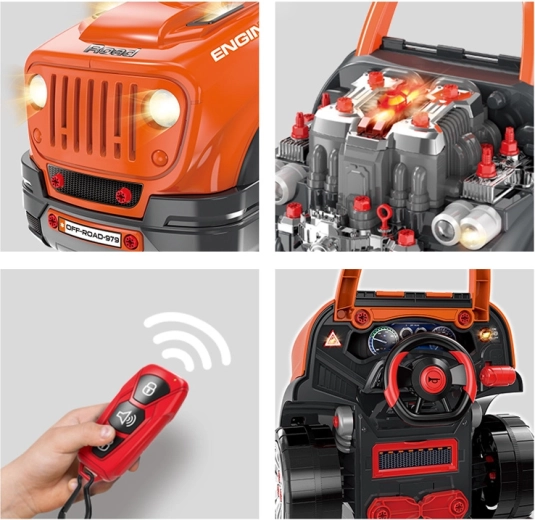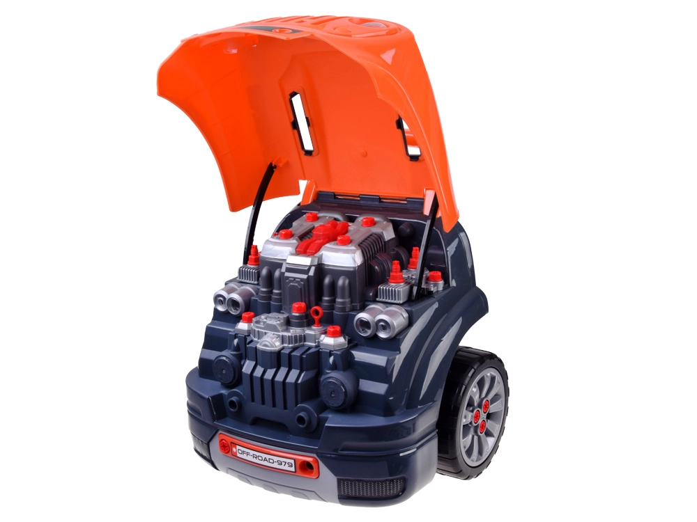 Det interaktive værkstedssæt til små mekanikere simulerer realistisk arbejdet på et autoværksted. Børn kan åbne motorhjelmen, skille og samle den aftagelige motor, skifte hjul og hjulkapsler, prøve start med knap og bruge lyd- og lyseffekter – fra horn og baklyd til alarm og nødblink.