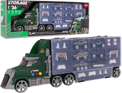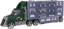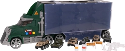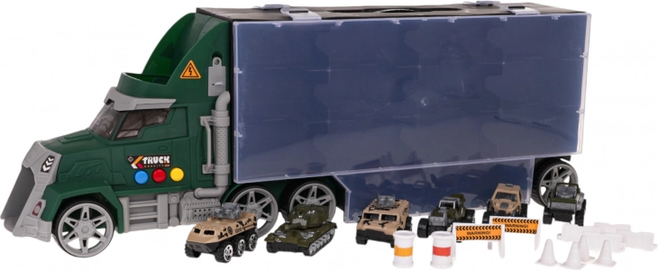 Sættet inkluderer 6 metal-/affjedrede småbiler af typen “pull-back” og masser af tilbehør (kegler, hegn, barrierer, tønder) til at bygge egne forhindringsbaner og militære scenarier. Et praktisk bærehåndtag gør det let for barnet at tage lastbilen med overalt.