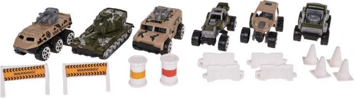 - militærlastbil, 6× lille bil, 2× tønde, 4× kegle, 4× hegn, 2× STOP-barriere