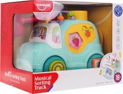 Ved at trykke på knappen aktiveres lydeffekter – motorstart, horn og glade melodier – ledsaget af blinkende lys. De bageste døre kan åbnes for nem udtagning af bolde og klodser. Legetøjet er lavet af kvalitets- og sikre materialer i livlige farver og er ideelt til daglig leg.
