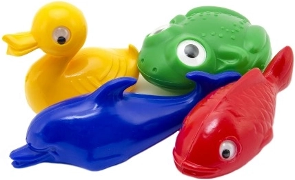 Det søde sæt til vandleg indeholder 4 plastdyr – en gul and, en blå delfin, en grøn frø og en rød fisk. Ideelt til badekar og pool og egnet til børn fra 0+.