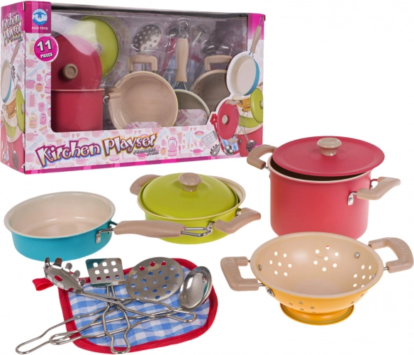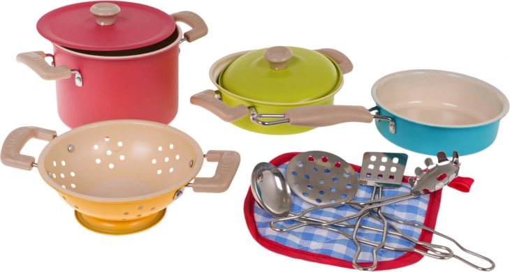 Farverigt børnesæt med gryder og køkkentilbehør – 11 dele i metal