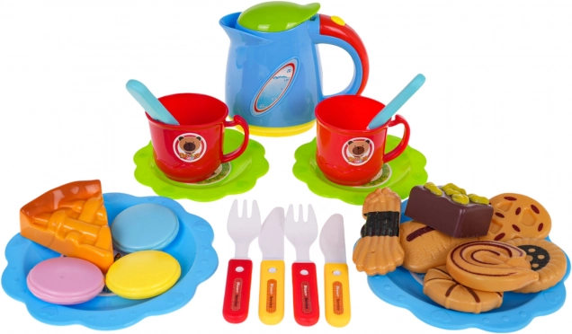 2 små knive (ca. 11 × 2 cm) og 1 stor (ca. 14 × 2,5 cm), 2 skeer (ca. 10 × 2,5 cm), 2 gafler (ca. 10 × 2,5 cm), 2 kopper (ca. 5 × 7 cm), 4 tallerkener (små Ø ca. 10 cm, store Ø ca. 13,5 cm), tekande (ca. 10 × 11 × 4 cm), fløjte, dekorative klistermærker