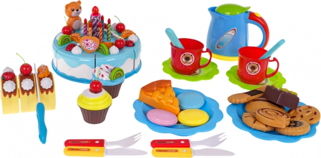 Stort fødselsdagssæt til børn fra 3 år med blå skærekage, lysende fødselsdagslys og rigt tilbehør til sjov rolleleg med festtema. Med 80 dele, livlige farver og kvalitetsplast udvikler børn deres kreativitet og finmotorik, når de pynter kagen og serverer lækkerier.