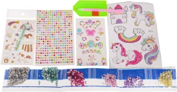 Sættet indeholder klistermærker med enhjørninger, glitrende sten og skabeloner. Børn skaber et unikt design og udvikler finmotorik og kreativitet.