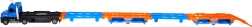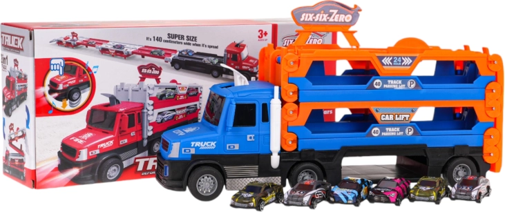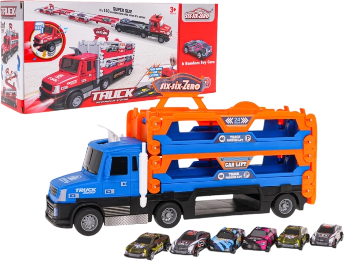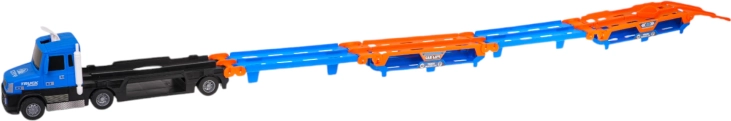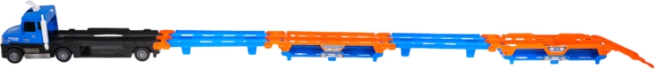 Når lastbilen foldes ud, skaber den en bane i to niveauer på op til 140 cm – perfekt til race med de medfølgende biler.
