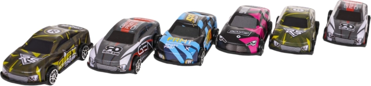 Pakken indeholder seks detaljerede biler med metalkarosseri og aerodynamisk design – klar til race.