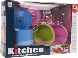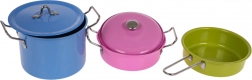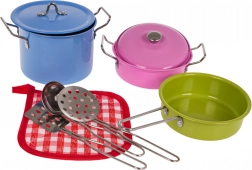 Gør dit barns leg mere farverig med dette skønne sæt af farverige køkkenredskaber. Indeholder en smuk blå gryde med ører og låg, en lyserød gryde med ører og låg, en grøn pande og forskellige køkkenredskaber, hvilket tilsammen danner det perfekte sæt for unge kokke.