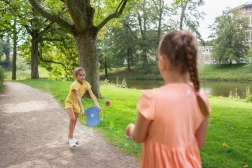 Spil for 2 spillere fra 6 år. Den luftige bold, lavet af bambus sammen med et elastisk stof, hopper muntert. Dette tennissæt er ideelt også for små børn, fordi disse ketchere kan holdes med begge hænder. De elastiske runde ketchere får bolden til at springe imellem sig som små trampoliner. Formålet med dette spil er at give børn mulighed for at have det sjovt uden smartphones og tablets.