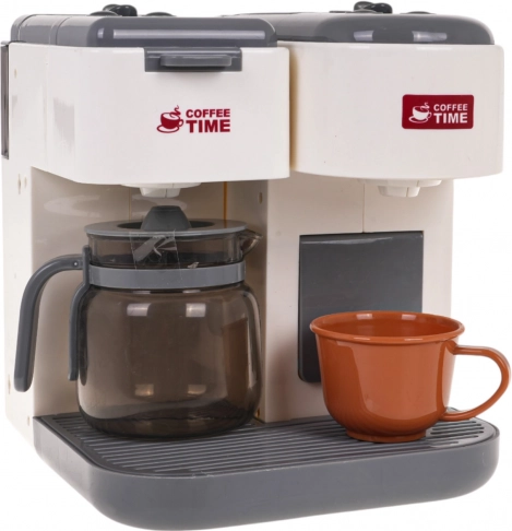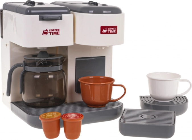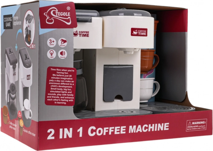 Det interaktive todelte sæt omfatter en brygger og en kapselkaffemaskine, som imponerer med sit realistiske udseende og funktioner. Børn kan bruge begge apparater samtidig eller adskille dem og lege med hver for sig. Kaffemaskinen har en åbnebar kaffeskuffe, vandtank og tre knapper til at brygge en lille eller stor kaffe samt aktivere vandfunktionen. Under brygning af kaffe afspilles realistiske lyde, og et rødt lys blinker ved vandudløbet.