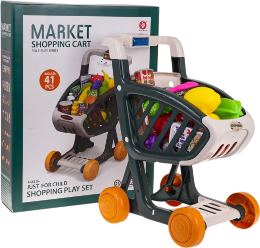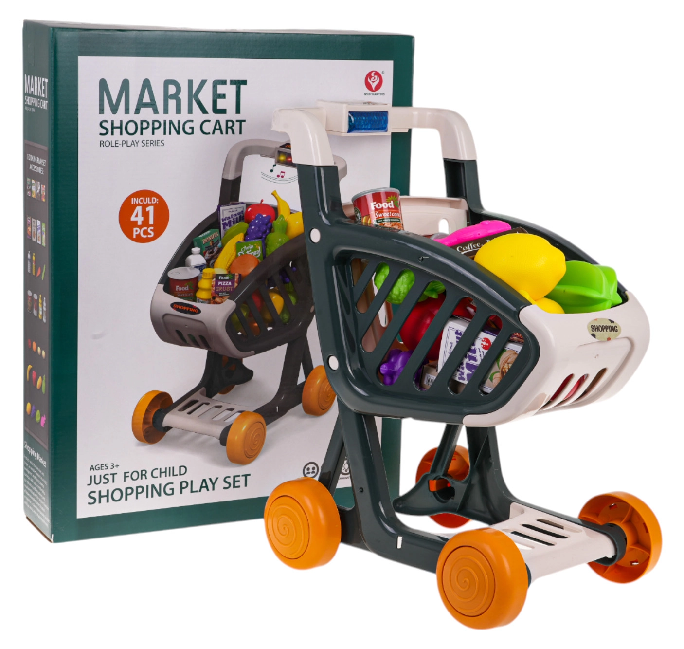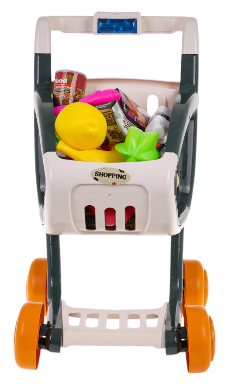 Sættet indeholder et farverigt udvalg af “indkøb” – frugt, grøntsager, drikkevarer og små madæsker – som hjælper med at udvikle finmotorik, kendskab til farver og former samt kommunikation. Betjeningspanelet med knap aktiverer blinkende lys og glade melodier, der motiverer børn til videre leg.