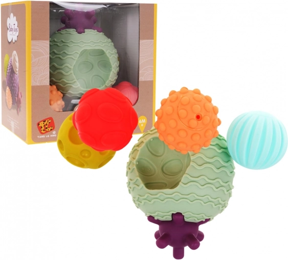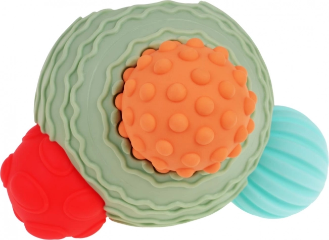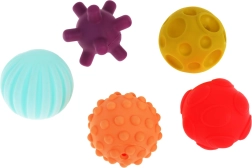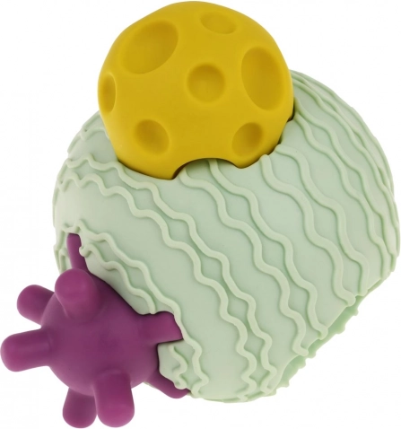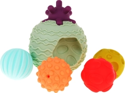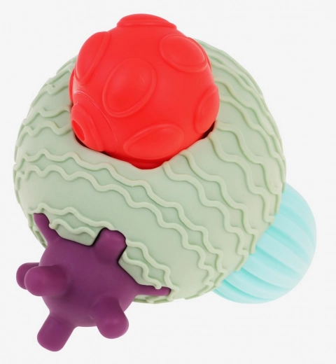 Denne sensoriske bold er den ideelle ledsager til små børns badetid. Sættet består af en stor bold og fire mindre bolde med forskellige teksturer og former. Hovedbolden har fordybninger, hvor de mindre bolde placeres, hvilket hjælper barnet med at lære at skelne mellem forskellige farver og former.