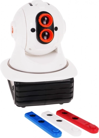 Projektoren projicerer mønstre, som du skal ramme – i tilstand L1 (scene) og L2 (spil, op til 4 hold). Der følger 3 slidere med motiver (ænder, dinosaurer, UFO) og 50 mål i spiltilstand. Når et mål rammes, “eksploderer” det og falder; manglende fuldførelse betyder, at niveauet gentages. Installationen er enkel: indsæt batterier, vælg tilstand, og kom i gang!