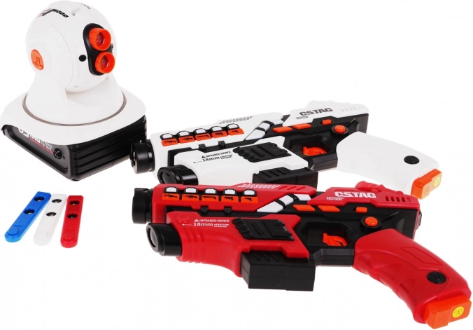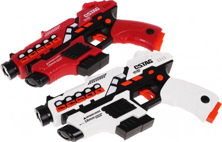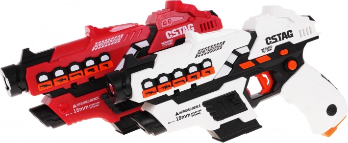 Vælg hold (rød, grøn, blå, hvid) og kæmp med en rækkevidde på ca. 40 m. Den infrarøde signalteknologi er sikker for børn og irriterer ikke øjnene.