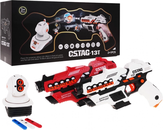 Træd ind i en verden af actionfyldt sjov med et lasersæt, der kombinerer spiller-mod-spiller-dueller og skydning på bevægelige mål fra projektoren. Pistolerne har livstæller, vibrationer og lyseffekter, så hvert træf føles og høres. Med 5 våbentilstande kan du tilpasse din spillestil og danne op til 4 farvede hold (rød, grøn, blå, hvid).