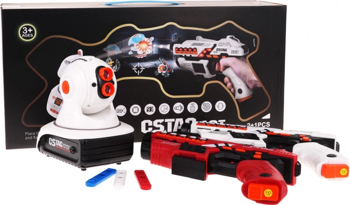 Et sjovt lasersæt til børn fra 3 år bringer actionfyldt leg både inde og ude. Sættet indeholder 2 lette laserpistoler og en interaktiv projektor med 3 udskiftelige slidere (ænder, dinosaurer, UFO). I kan spille mod hinanden eller mod projicerede mål, vælge mellem 5 skydetilstande, op til 4 hold, med lydeffekter, vibrationer og sikker infrarød teknologi.