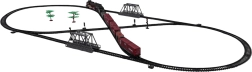 - lokomotiv ca. 23 cm x 8 cm x 5,5 cm .- passagervogn ca. 13 cm x 6 cm x 4,5 cm, .- kulvogn ca. 14,5 cm x 7 cm x 4,5 cm, .- vogn med pilot ca. 12,5 cm x 5 cm x 4,5 cm, .- vogn med containere ca. 22,5 cm x 7 cm x 4,5 cm, .- bane ca. 216 cm x 99 cm, .- emballage ca. 87,5 cm x 43 cm x 9,5 cm, . |
