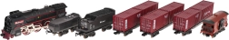 - lokomotiv, .- passagervogn, .- kulvogn, - vogn med pilot, - 3 x vogn med containere, .- skinnekomponenter, .- 2 broer, .- 2 skilte, .- 2 træer, .- vandpipette, .- USB-opladerkabel, .- manual, . |