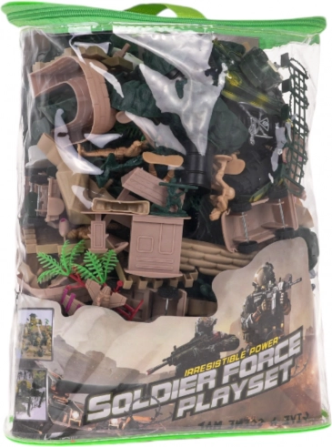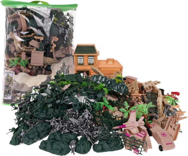 Stort sæt med soldater og militærkøretøjer til børn fra 3 år med 400 dele fulde af action: 250 soldater (3 farver, 2 størrelser), kampvogne, biler, fly, skibe samt en base med forhindringer. Alt er lavet af holdbar plast og leveres i et etui med lynlås for nem transport.