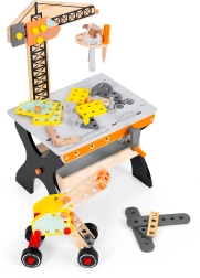 Arbejdsbordet med kran, værktøj og forbindelser udvikler fantasi, finmotorik og lærer grundlæggende håndværk på en sikker måde.