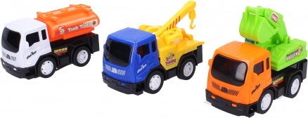 Byggebil med friktionsmotor, 12 cm, til børn fra 3 år. Varianter: tankbil, brandbil, fejeblad, kranbil, gravemaskine, betonblander.