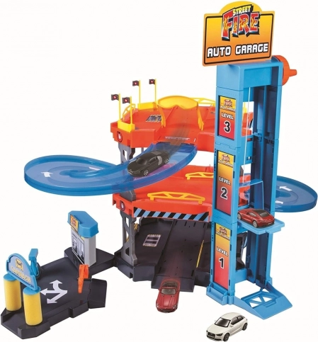 Denne farverige, fleretagers garage fra Street Fire-serien giver børn masser af scenarier til kreativ leg. Med den manuelle elevator flytter du let bilen mellem etagerne, mens den spiralformede rampe sørger for hurtige nedkørsler og flydende kørsel. Der medfølger også en bilvask og en støbt model i skala 1:43, så sjoven kan starte straks efter udpakning.