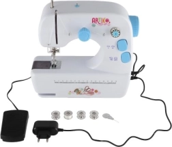 Maskinen drives enten af 4x AAA-batterier, som ikke er inkluderet, eller af en ekstern strømforsyning inkluderet i pakken. Pakken inkluderer også spoler og en reserve nål, hvilket muliggør problemfri syning.