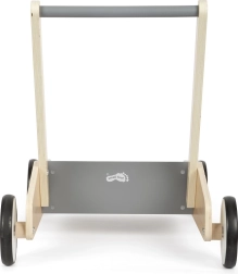 Opdag en pålidelig makker til de første skridt. Den robuste konstruktion af kvalitetslamineret træ kombineret med skifergrå elementer giver tryghed, sikkerhed og et moderne udtryk. Afrundede kanter og gummibelagte hjul er skånsomme mod både små hænder og gulve, mens bremsesystemet hjælper med at holde et roligt tempo under gangtræningen.