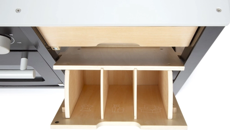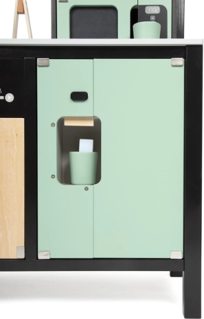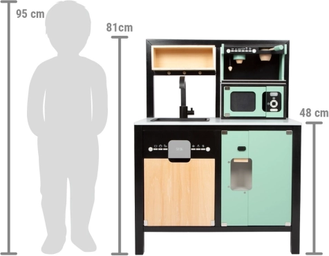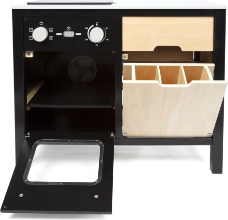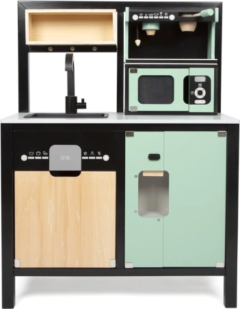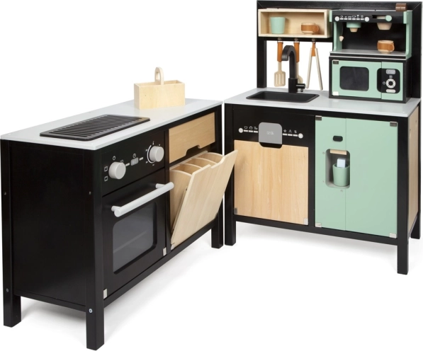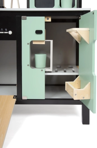 Kvalitets træforarbejdning, åbne/lukkedøre samt mange hylder og rum holder orden i ethvert køkken. Børn træner organisering, finmotorik og sociale færdigheder.