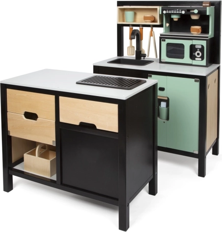 Dette robuste legekøkken i industriel stil er designet til lange timer med kreativ madlavning. Den modulære køkkenø kan bruges separat eller sættes sammen for at skabe en hjørneopsætning – ideel til ethvert børneværelse. Åbn/luk-døre, overskuelige opbevaringsrum og realistiske betjeningsknapper giver en maksimal autentisk oplevelse.