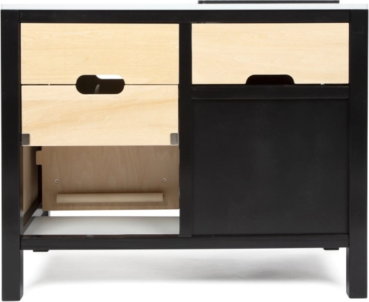Den elegante kombination af sort ramme og naturtræ giver børneværelset et moderne præg. Den fritstående ø kan forbindes med køkkenet og danne en hjørneløsning – et fleksibelt legeområde efter behov.