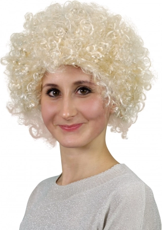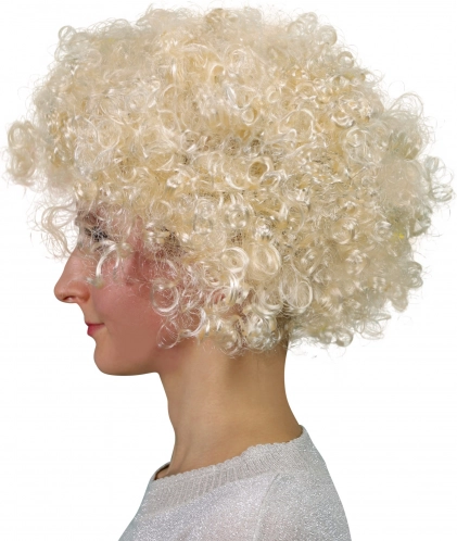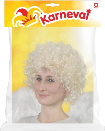 Den korte blonde paryk med afrokrøller fuldender dit englekostume på få sekunder og sikrer et iøjnefaldende udtryk.