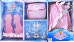 • Komplet udstyr: skørt, sko, krone, scepter, øreringe, ring, halskæde og taske