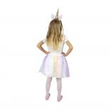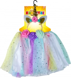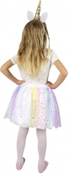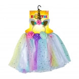 Forvandl dit barn til en magisk enhjørning med dette farverige kostume, som inkluderer et tutuskørt og en hårbøjle med enhjørning. Sættet er perfekt til børn, der vil nyde eventyrlige oplevelser under legen. Skørtet er pyntet med farvet tyl med stjernedekor og er designet til nem pasform takket være den elastiske talje.