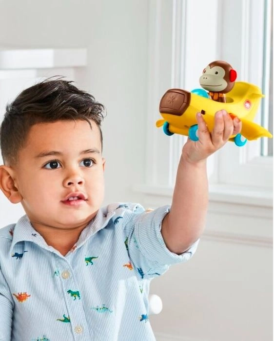 Marshall Monkey bil-fly! Små børn vil være vilde med vores yndige 2-i-1 bananbil og fly samt den bevægelige abefigur. De er klar til at udforske nye dimensioner af sjov leg – tryk blot på fronten for at folde vingerne ud og forvandle bilen til et fly.