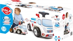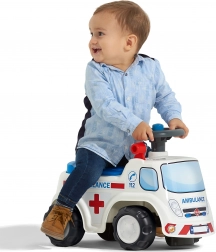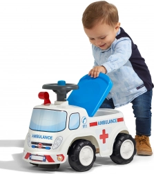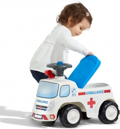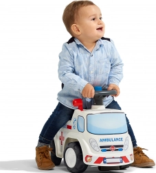 Den stilfulde gåbil i ambulance-look understøtter børns fantasi og udvikling af balancen. Takket være rattet med horn lærer børnene at koordinere bevægelserne bedre, mens brede hjul og en stabil konstruktion giver tryghed på de første køreture.