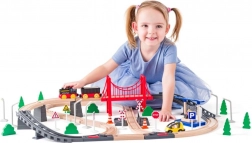 Denne træjernbane giver børn timevis af sjov og læring. Sættet indeholder farvede skinner, bro, træer, køretøjer og trafikskilte, som stimulerer imaginativ leg og kreativitet. Hovedattraktionen er det batteridrevne lokomotiv, der glider let gennem banen og opmuntrer børn til at udforske nye ruter.