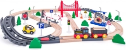 Komplet sæt med skinner, bro, trafikskilte, træer og køretøjer, som understøtter kreativitet og opbygning af forskellige spor.