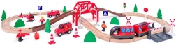 Komplet sæt med tog, skinner, bro, trafikskilte, træer og figurer giver utallige lege-muligheder og scenarier fra brandmændenes verden.