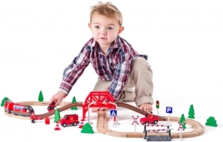 Den træbaserede brandmands-togbane giver børn timevis af kreativ leg. Den lange bane på ca. 350 cm med bro, skilte og figurer skaber actionfyldte redningsscenarier. Kvalitetsdele i træ er behagelige at røre ved og robuste til daglig leg.
