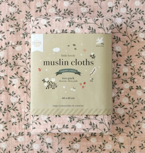 Sæt med 2 musselinsbleer i økologisk bomuld 60×60 cm med blomsterprint. Lette, absorberende og åndbare – ideelle til spisning, aftørring og bad.