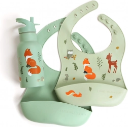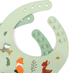 Praktisk sæt med to silikone-hagesmække for komfortabel fodring uden rod. Den ene hagesmæk har et mønster med skovdyr, den anden er ensfarvet. Takket være den justerbare lukning sidder de perfekt, de har en dyb opsamlingslomme, er vandafvisende, lette at rengøre og kan nemt rulles sammen i tasken. Fremstillet af 100% fødevaregodkendt silikone for maksimal sikkerhed og lang holdbarhed. Vandafvisende, nem at rengøre, opsamlingslomme, justerbar størrelse.