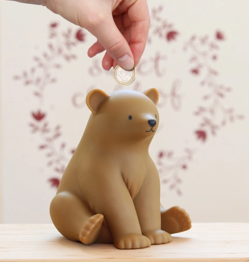Den søde sparegris formet som en stor brun bjørn fra A Little Lovely Company hjælper børn med at spare deres første penge og pynter samtidig på børneværelset. Den har åbning til mønter og sedler og på undersiden et skruelåg for nem tømning. Ideel som dekorativt design til børneværelse eller legerum.