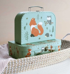 Oplev et magisk sæt med to kufferter med illustrationer af ræv, ugle og andre skovvenner. Med to størrelser kan du nemt organisere legetøj, farveblyanter og små skatte. Robust papkonstruktion med kvalitetsstikninger tåler daglig brug, mens metalhåndtag og spænde giver behagelig bæring og sikker lukning.