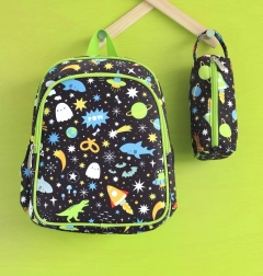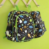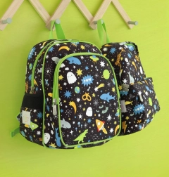 Stilfuld børnerygsæk med rumtema, ideel til børnehave og udflugter. Den har en rumlig hovedlomme, en isoleret frontlomme til madpakke og to sidelommer til drikkeflasker. For komfort og sikkerhed har den polstrede skulderstropper, brystrem mod at glide af og åndbart, polstret rygpanel.