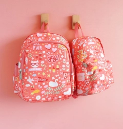 Den stilfulde koralrosa rygsæk med et muntert motiv vil glæde små rejsende. Takket være de polstrede skulderstropper, en brystrem mod at stropperne glider af, samt et åndbart, polstret bagpanel bæres den behageligt hele dagen. Den isolerede frontlomme holder mad og drikke friske længere, mens sidelommerne er ideelle til en drikkeflaske.