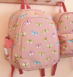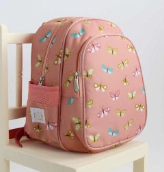 Stilfuld lyserød rygsæk med sommerfuglemotiv fra A Little Lovely Company, perfekt til børnehave og udflugter. Den har en rumlig hovedlomme, en isoleret forlomme til madpakke, sidelommer til drikkedunk og polstrede, justerbare stropper med brystrem for sikker og komfortabel bæring.