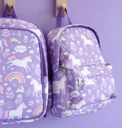 Brystremmen hjælper med at holde stropperne på plads, så rygsækken sidder bedre – også når der løbes og leges. Det farverige print med enhjørninger og regnbue gør rygsækken til en stilfuld makker for små eventyrere.
